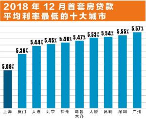 从城市来看,2018年12月全国首套房贷款平均利率最低的城市前十位分别为:上海5.09%、厦门5.36%、大连5.44%、北京5.45%、福州5.46%、乌鲁木齐5.47%、太原5.53%、昆明5.54%、深圳5.55%、广州5.57%。
