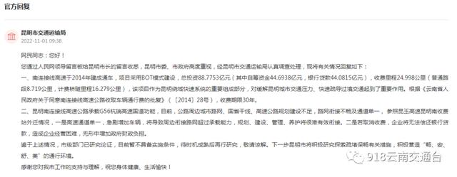 昆明市交通运输局回复表示,南连接线高速于2014年建成通车,项目采用BOT模式建设,总投资88.7753亿元(其中自筹资金44.6938亿元,银行贷款44.0815亿元),收费里程24.998公里(普通路段8.719公里,计费桥隧里程16.279公里),该项目作为昆明绕城快速系统的重要组成部分,对缓解昆明城市交通压力、快速疏导过境交通起到了重要作用。根据《云南省人民政府关于同意南连接线高速公路收取车辆通行费的批复》(〔2014〕28号),收费期限30年。