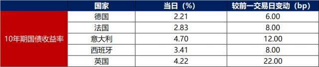 9月29日,欧洲国债收益率在前一日回落后重拾升势,英债收益率领衔上行。英国10年期国债收益率重新上行22bp至4.22%,其余主要欧洲经济体中,德国10年期国债收益率上行6bp至2.21%,法国、意大利、西班牙10年期国债收益率分别上行8bp、12bp和8bp。