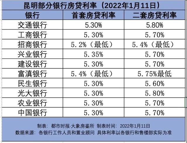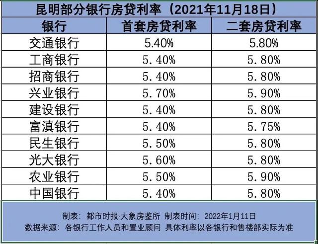 当时,昆明首套房的贷款利率基本在5.4%以上,最高的是兴业银行,达到5.7%。二套房利率大多数为5.8%。