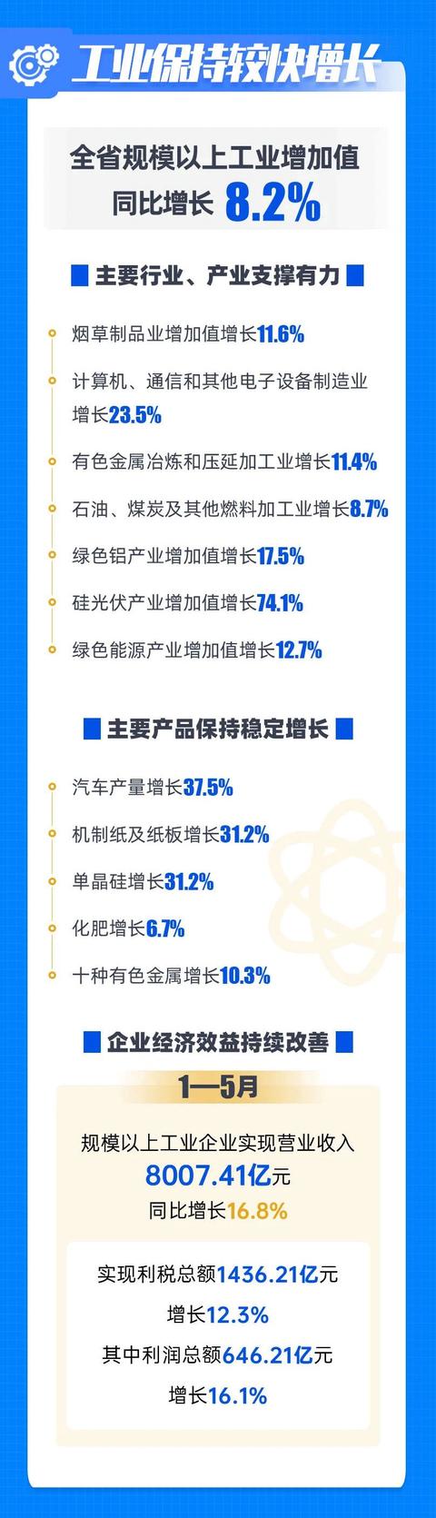 主要行业、产业支撑有力。烟草制品业增加值增长11.6%;计算机、通信和其他电子设备制造业增长23.5%;有色金属冶炼和压延加工业增长11.4%;石油、煤炭及其他燃料加工业增长8.7%。绿色铝产业延链补链稳步推进,增加值增长17.5%,比一季度提高12.3个百分点;硅光伏产业快速发展,增加值增长74.1%,比一季度提高13.3个百分点;绿色能源产业稳中向好,增加值增长12.7%,比一季度提高1.2个百分点。