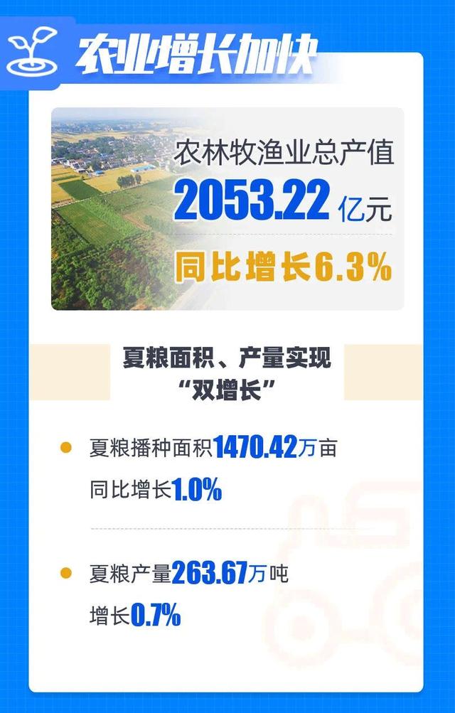夏粮再获丰收。夏粮面积、产量实现“双增长”。夏粮播种面积1470.42万亩,同比增长1.0%;夏粮产量263.67万吨,增长0.7%。特色经济作物保持良好发展势头。全省蔬菜播种面积1064.98万亩,增长4.0%;产量1427.50万吨,增长8.5%。茶叶、水果等经济作物产量均有不同增长。畜牧业带动明显,生猪出栏增长12.9%,比一季度提高6.3个百分点,猪牛羊禽肉产量240.38万吨,增长9.6%。