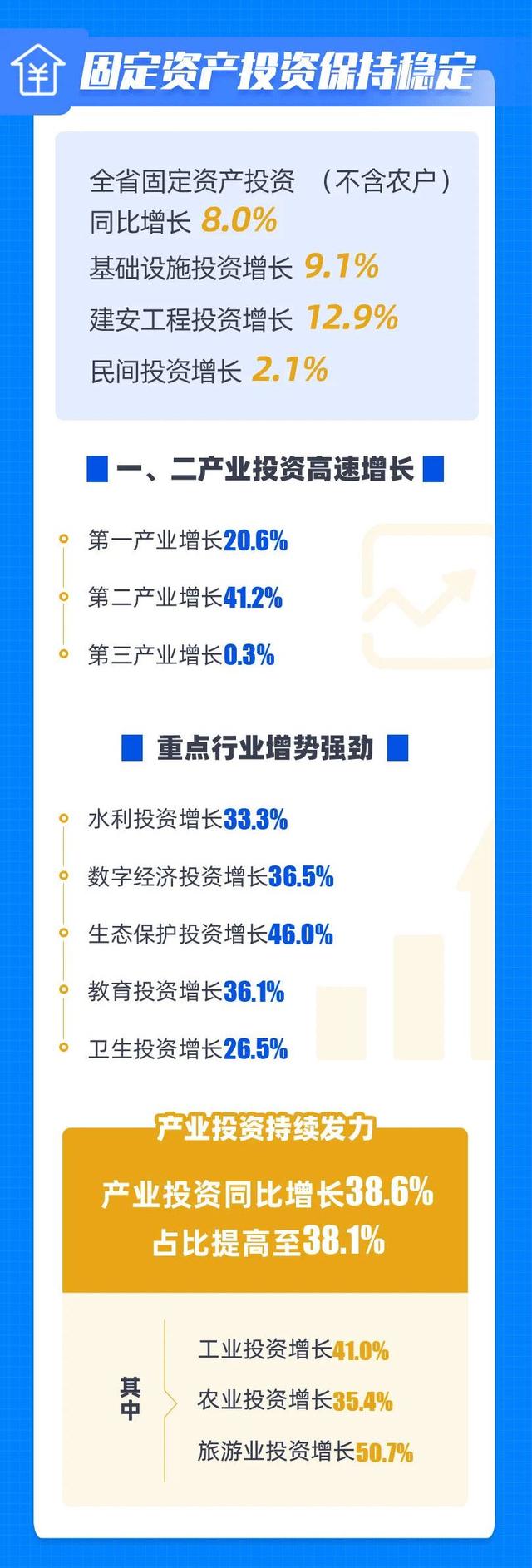 重点行业增势强劲。水利投资增长33.3%;数字经济投资增长36.5%;生态保护投资增长46.0%;教育投资增长36.1%;卫生投资增长26.5%。房地产开发投资和交通投资增长乏力,分别下降23.8%、11.2%。