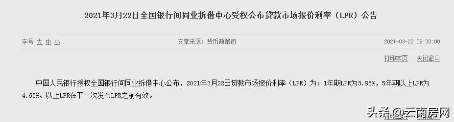 3月22日,中国人民银行公布贷款市场报价利率(LPR)公告。其中1年期LPR为3.85%,5年期以上LPR为4.65%,与前一个月持平,已连续11个月未变。