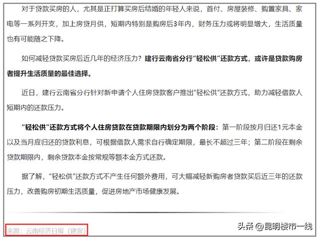 近日,建设银行云南分行通过云南经济日报平台官宣“轻松供”还款方式。