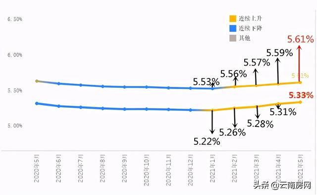 根据融360数据研究院统计,全国42个重点城市674家银行分支机构房贷利率的监测数据显示,2021年5月(数据监测期是2021年4月20日-2021年5月18日),全国首套房贷款平均利率为5.33%,二套房贷利率为5.61%,均环比上月增加2BP。