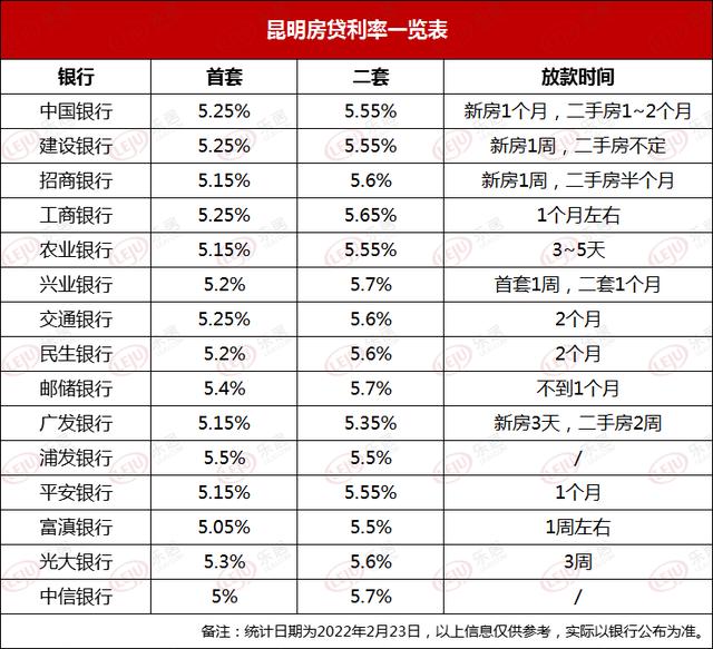 目前,昆明首套房房贷利率普遍在5.15%~5.25%之间,最低的为中信银行5%与富滇银行5.05%,最高为浦发银行5.5%,二套房在5.5%-5.7%之间,最低的为广发银行5.35%,最高的为邮储银行、兴业银行、中信银行,而去年一度达到首套5.6%、二套6%。值得一提的是,多家银行均表示,部分合作新房楼盘的利率比正常利率会低一点。