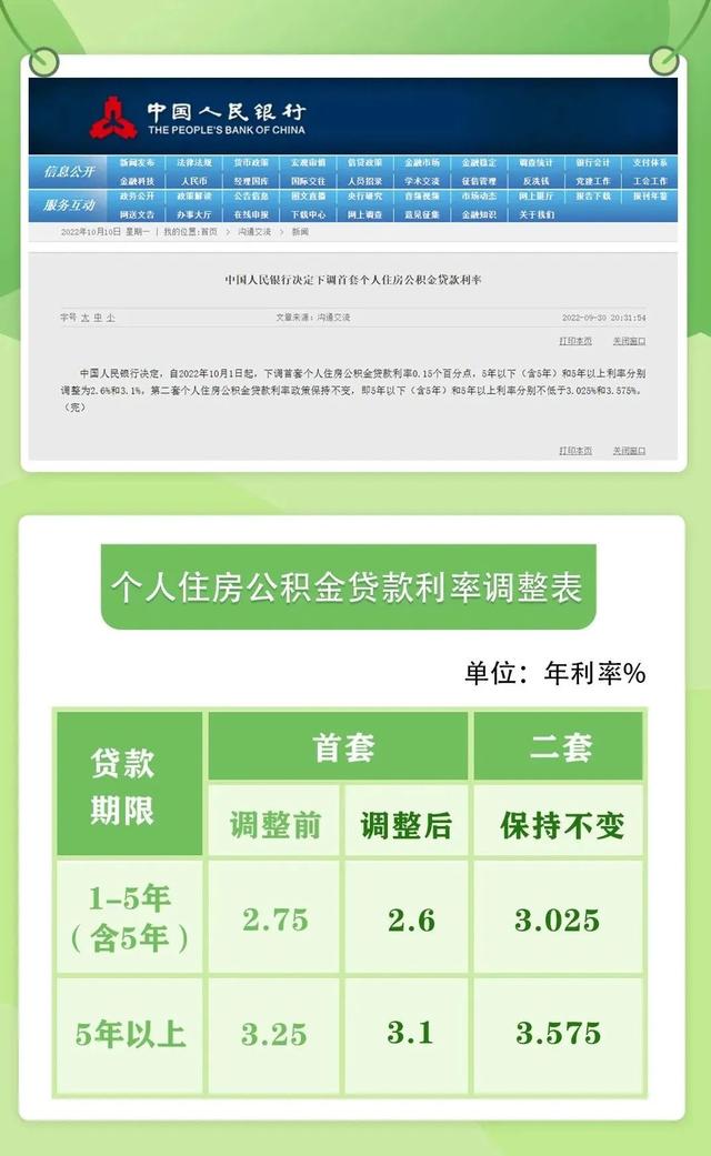 一、自2022年10月1日起,下调首套个人住房公积金贷款利率,五年以下(含五年)个人住房公积金贷款利率由2.75%下调至2.6%;五年以上个人住房公积金贷款利率由3.25%下调至3.1%。