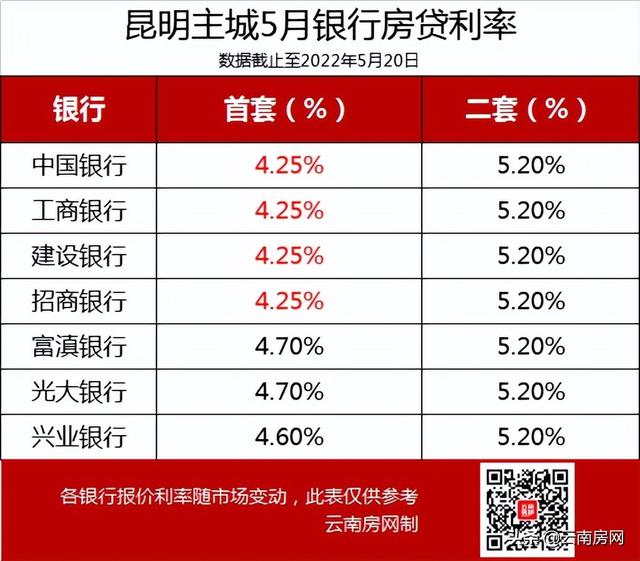 经云南房网致电了解,目前昆明已有中国、工商、建设和招商等4家银行执行此政策。另据网友透露,民生、广发和华夏银行首套房贷款利率也已降至4.25%,利率下调银行已有7家。富滇、光大和兴业银行目前暂时未接到总行通知,仍按原4.6-4.7%的首套利率执行。