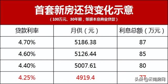 如果按照当前最新利率报价,以100万元30年期等的本息商贷计算,昆明置业者在本月购入住房,月供可低至4919.4元,总利息为77万元,与利率最高报价行月供差额达到267元/月。