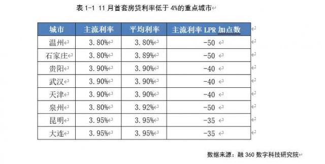 42个一二线城市中,有8个城市的首套房贷目前低于4%,分别是温州、石家庄、贵阳、武汉、天津、泉州、昆明和大连,其中温州、石家庄和泉州的首套房贷利率的主流利率已经降至3.8%。