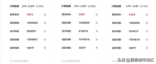 而相比此次调整前,昆明市场普遍约5.1%(LPR 45BP)的利率水平,总利息多出44478元,每月多还约124元。