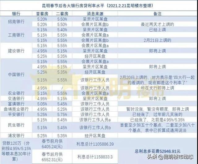 而就在今年2月底,我们曾提到,部分开发商售楼部反馈“3月1日四大行要统一上调利率”(实际上20/21日已经调了),从当时昆明各大行的情况看,大部分银行首套房利率5.15~5.25%之间,二套房5.4~5.55%居多,实际执行的利率还要根据个人征信及流水来具体确定。