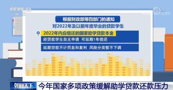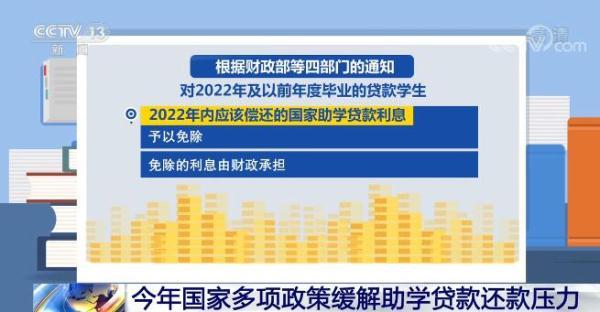 根据财政部等四部门的通知,对2022年及以前年度毕业的贷款学生2022年内应该偿还的国家助学贷款利息予以免除,免除的利息由财政承担。对2022年及以前年度毕业的贷款学生2022年内应偿还的国家助学贷款本金,经贷款学生自主申请,可延期1年偿还,延期贷款不计罚息和复利,风险分类暂不下调。
