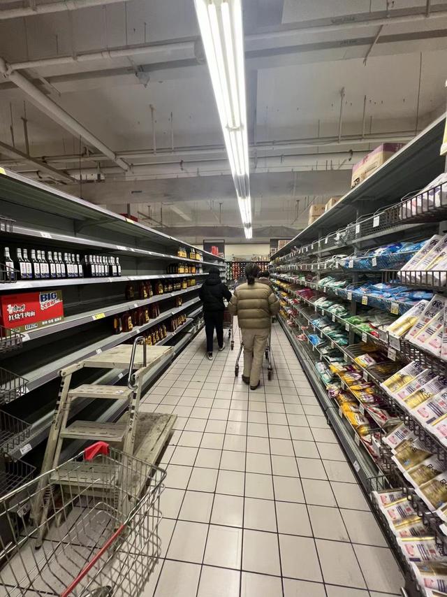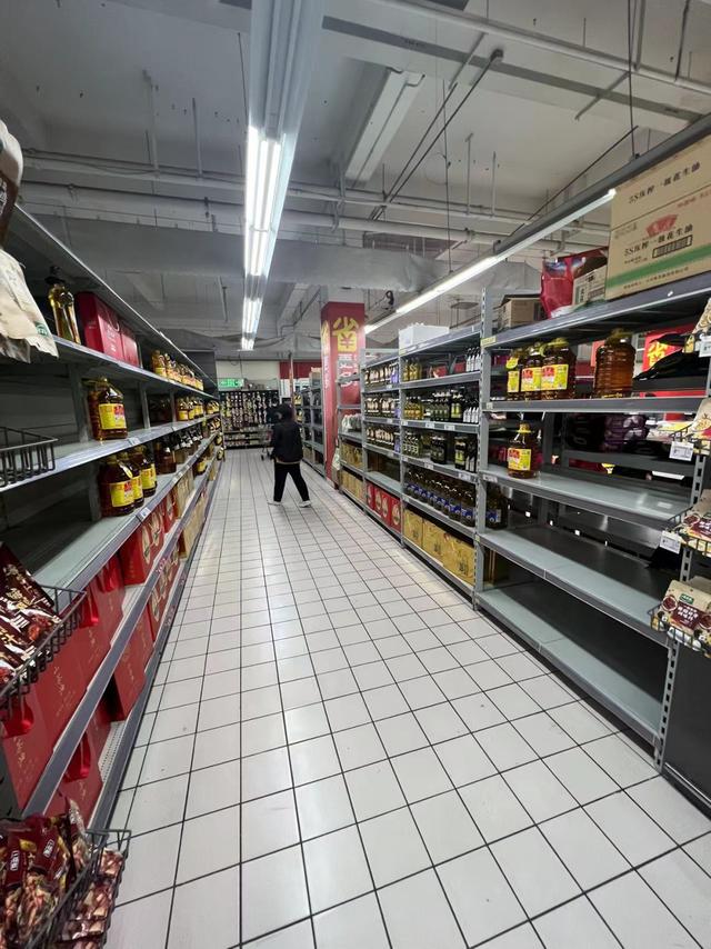 摆放食用油的区域、零食的区域、洗衣粉的区域、日常家庭用品的区域……很多区域的货架都空了很多。