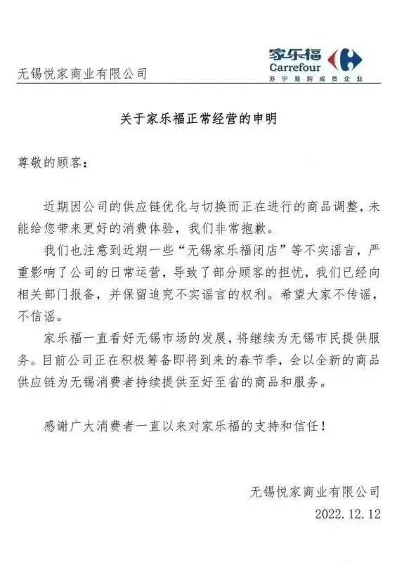 至于无锡,无锡悦家商业有限公司发布了一份《关于家乐福正常经营的申明》,文中的说法与其他城市的说明基本一样。