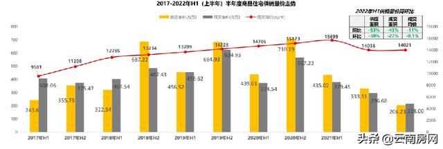 2022年上半年,昆明商品住宅供销面积平均下滑近5成,至历史冰点水平。其中,住宅上半年供应206万方,环比去年下半年的336万方供应量,下滑近4成;与去年同期的435万方相比,跌势更为明显,降幅达5成;