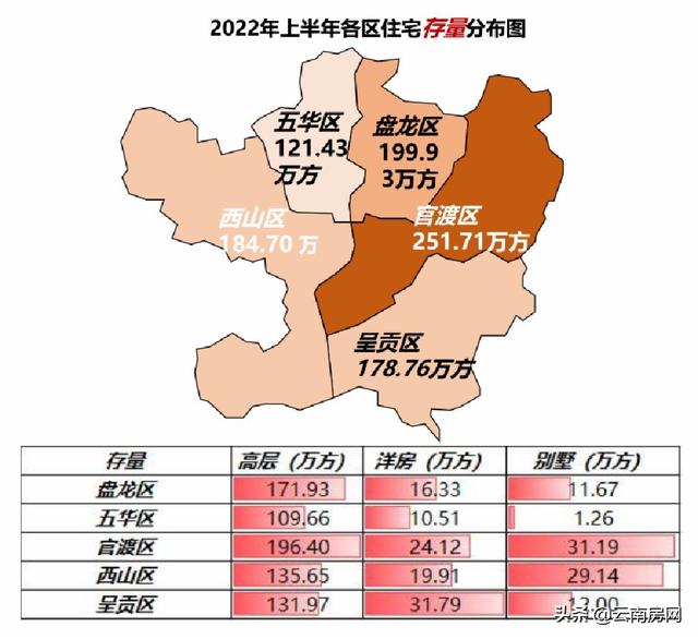 在各区存量分布图中,这个数字更为形象。截止6月,住宅去存前三区域就是官渡(251.71万方)、盘龙(199.93万方)和西山(184.7万方)。