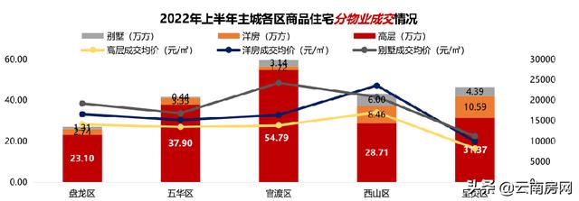 而就供应来说。官渡区地产项目密集,因此在上半年供应了57万方住宅,西山区紧随其后供应了52.11万方住宅,盘龙区供应了39.62万方住宅。