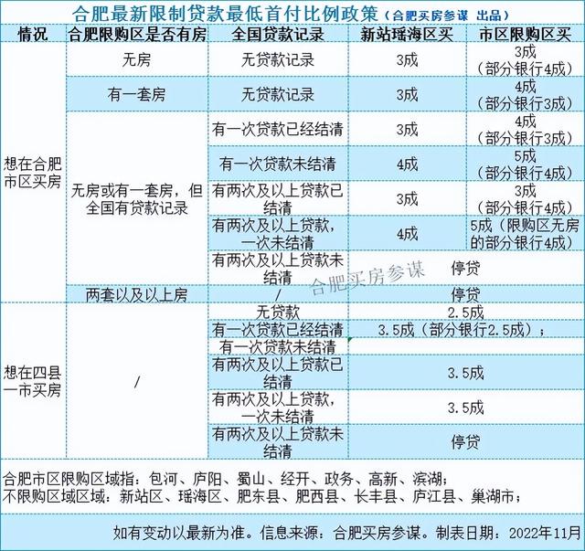 两张表看懂合肥限购与贷款最新政策,过限购办法都在这里齐全的了(含贷款利率,2022年11月15日合肥买房参谋出品,如政策有变动,以最新公布或问询为准)。