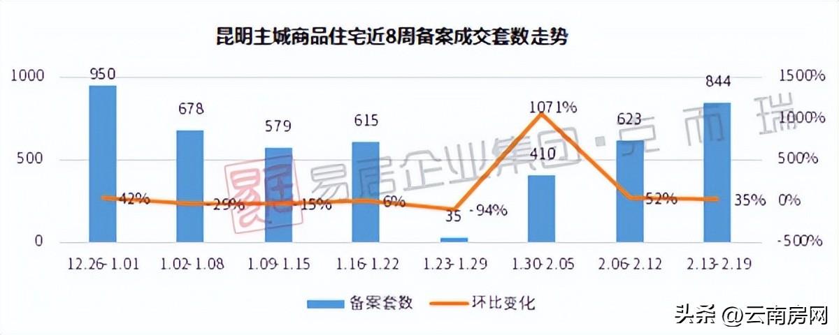 一方面是昆明新房新增供应量跌入历史低谷,但另一方面,房地产市场却出现快速回暖的迹象,今年春节后成交迅速恢复,从最近8周成交套数的V字形走势可以看出,已基本达到节前水平,最近1周(2.13-2.19)成交备案844套,甚至还超过了去年的周均成交量。克而瑞分析认为,2月份热销项目从占比、分布到产品结构等多方面展现出复苏的全面性,当前市场出现整体性回暖势头。